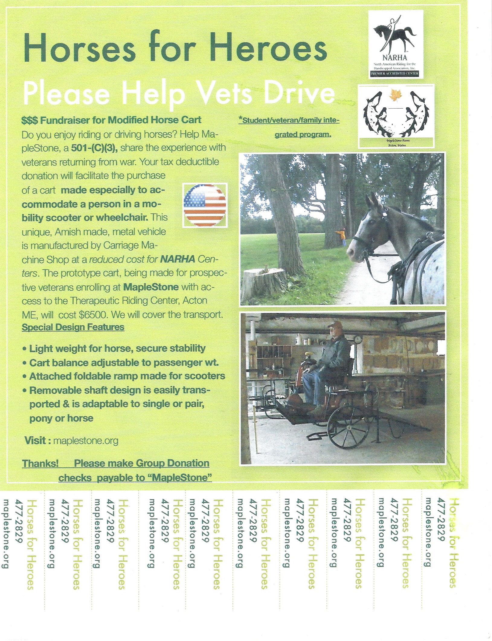 Currently, MapleStone Farm TRC is using both carts and carriages in our program. We hope to become part of the growing program called Horses for Heros organized by NARHA. The goal of this program is to provide veterans with the opportunity to learn and participate in the wonderful world of carriage driving! We are currently fundraising to purchase a specially manufactured wheelchair/power-scooter accessible cart. If you would like to aid us please see our donations page or click on the link horses for heros flyer.jpg to download an informational flyer. Monetary donations $25.00 and over will be commemorated by having the donor’s name(s) on a plaque that will be affixed to the cart. See the cart pictured at the left (top).